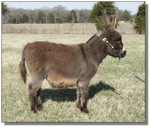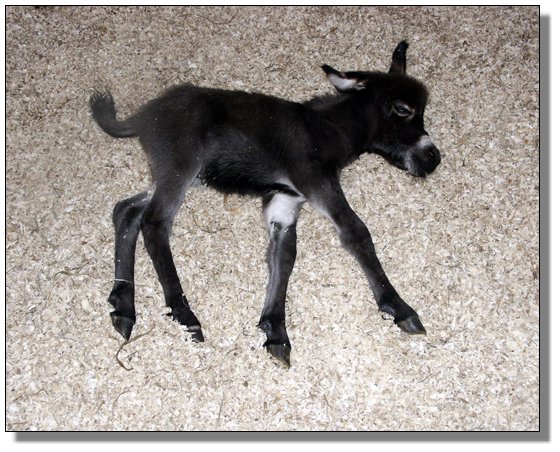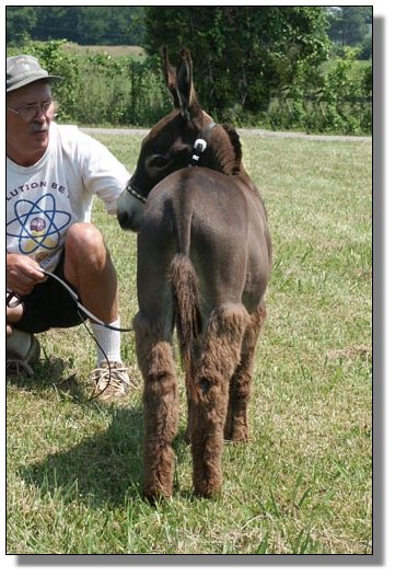 Our second foal of the 2004 season. Check out his big banana ears!! Bing is named after Tony Soprano's nightclub. He is tiny and very correct and just like Tony ..... very bad to the bone!!! Click here to see a rear shot of his sire, Engman's Commanche. Photos of Engman's Commanch are compliments of P&K Meyer's Miniature Donkeys in Wisconson.