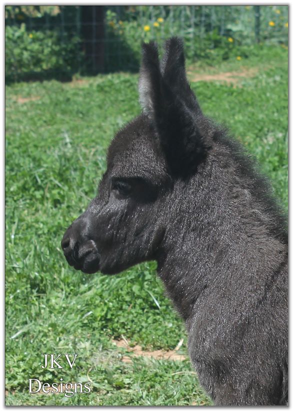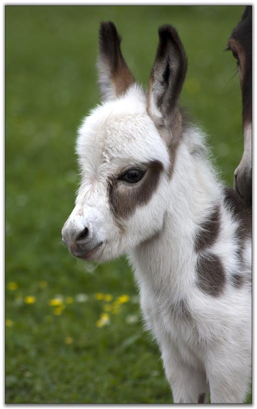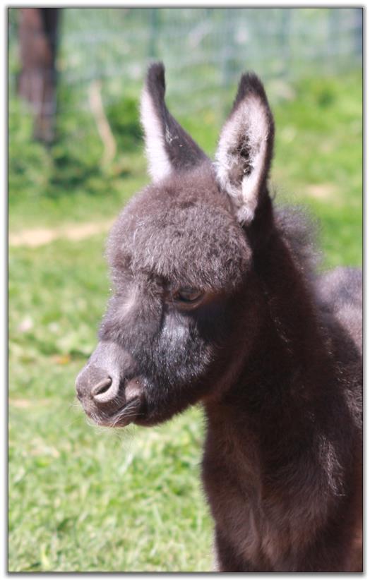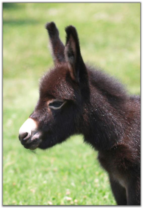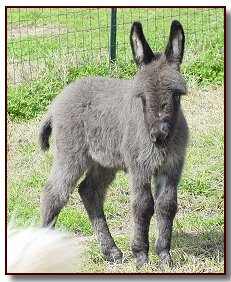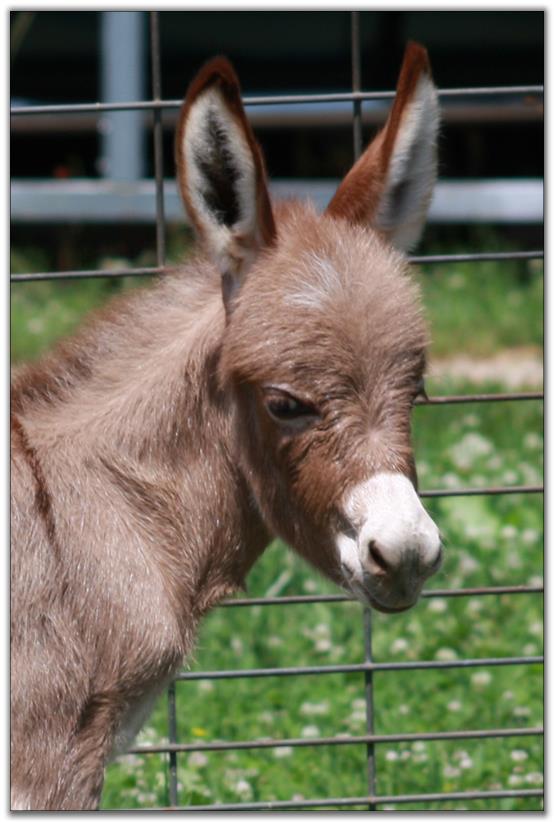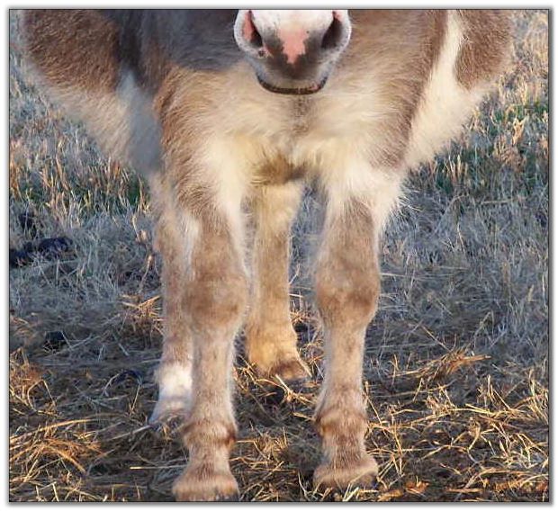 We were blessed with a healthy baby born on Easter Sunday. We named him Pasco as it means 'born on Easter.' Thank you to Asta in Denmark for naming him! His color appears to be a gray/roan or brown/roan with an intermediate muzzle and no eye rings. This boy is definately show quality with his heavy bone and straight legs. He has a tiny head with a perfect bite. We can put our hand inbetween his front legs his chest is so wide. He measured not quite 23½" tall so we feel that he will be too tall for a herd sire. He will be a gorgeous driving donkey when he matures with his spotlight on his forehead.
