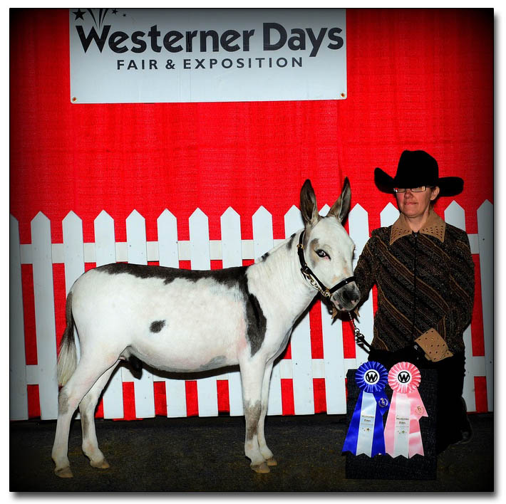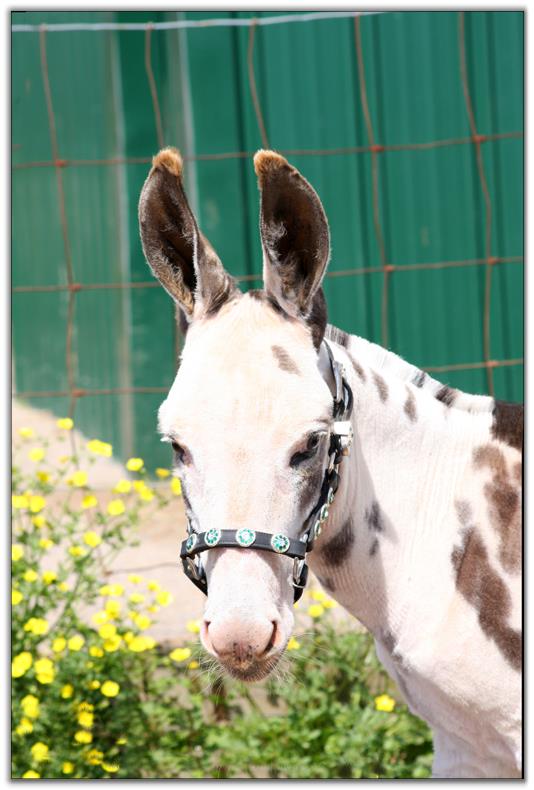 Cookie is related to several jennets in our herd. Her dam is Sunset Acres Tilly, one of our favorite dark spotted jennets that has produced another of our favorites, Windcrest Autumn Sunrise.  Cookie is also a half sister to Pocketful of Poseys who we are also offering for sale. Cookie's grand sire, Willow Creek Luigi, is a two-time ADMS National Halter Champion and an NMDA National Halter Champion. Cookie is built like a sherman tank with a super wide, wide chest and rump. She has a gorgeous head, a short back, and very heavy bone. Cookie is super friendly and easy to catch and handle. She is up to date on all vaccinations, de-worming and hoof trims. She is microchipped. A big 'thank you' to Dena Wilson for her expert handling of Cookie during her photo session. If you purchase two or more of our donkeys we will be glad to give you a package price. Payments are acceptable at no extra charge.