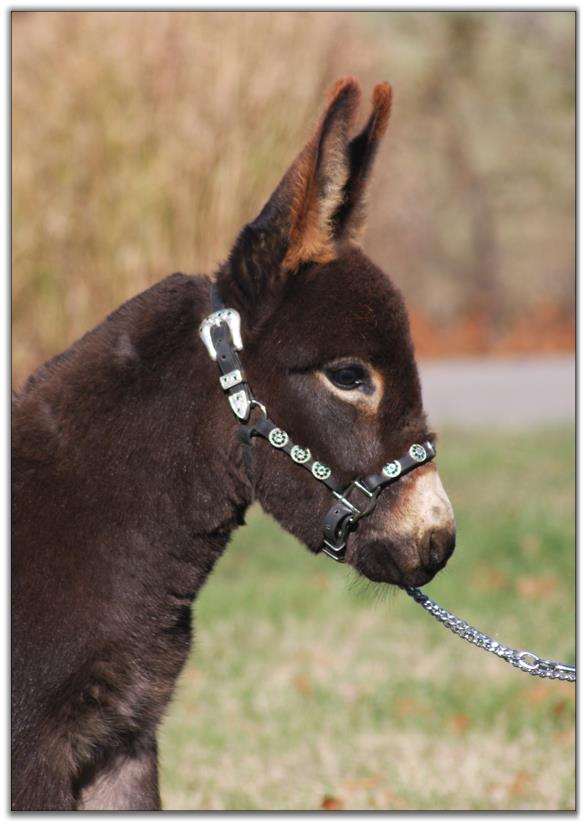 Gentleman Jack is a handsome dark mahogany brown jack. He has a perfect bite and very stocky conformation. He will make a greatl driving donkey when he matures. Gentleman Jack would make someone a wonderful Christmas present. We will gladly hold him until Christmas at no extra charge. Jack has been weaned and we have started his first round of vaccinations. He will be up to date on hooves, de-worming, and all vaccinations including West Nile before he leaves our farm. (Update:  Gentleman Jack was given his lost vaccination on 12/18/10. He is now up to date and good until next year!) Gentleman Jack has a negative coggins reported dated 12/14/10. The new photos and video were taken on 11/28/10. A special 'thank-you' to my friend, Dena Wilson, for her expert handling of Gentleman Jack, for his photo session.  Gentleman Jack is super sweet and easy to handle. He is a very 'ears up' donkey with outstanding conformation who would do very well in the show ring.  Of course he would be just as happy looking beautiful as a pet in your back yard too.