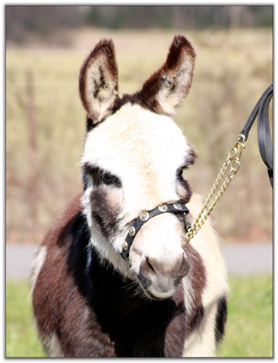 Parkway Farms Scout, dark brown and white spotted miniature donkey jack for sale