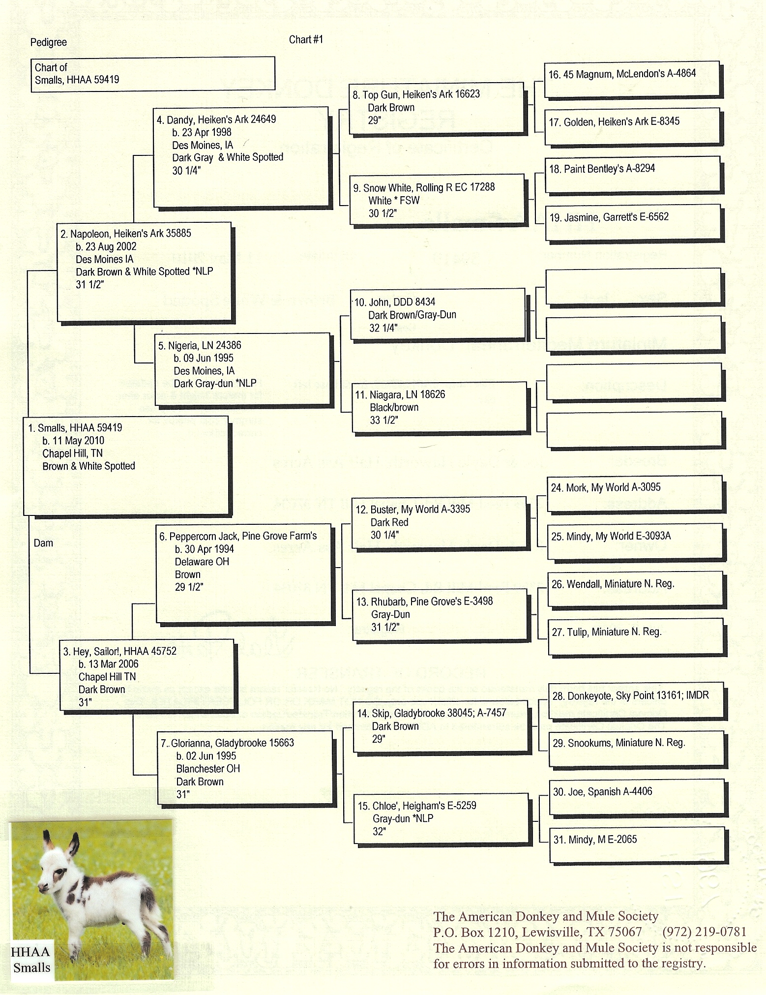 Grand Sire:  Hartman Donkeys Trenton, 33 ½" brown & White Spotted
