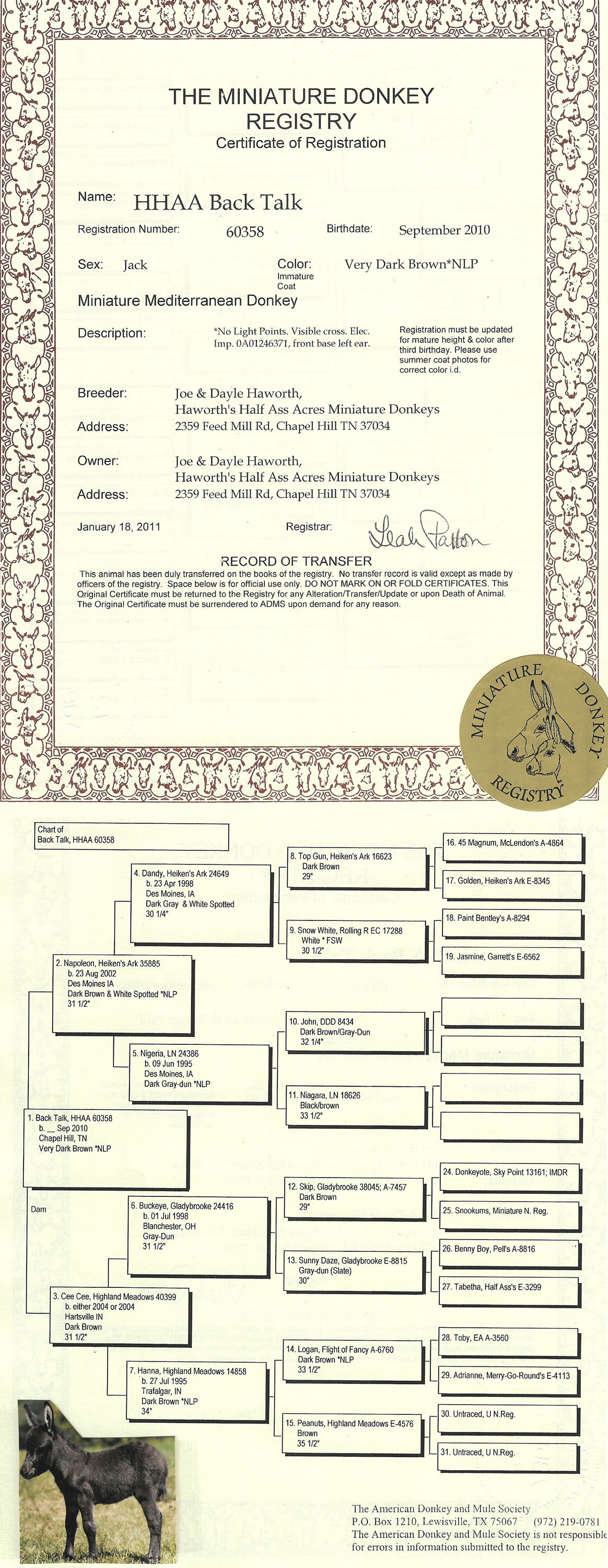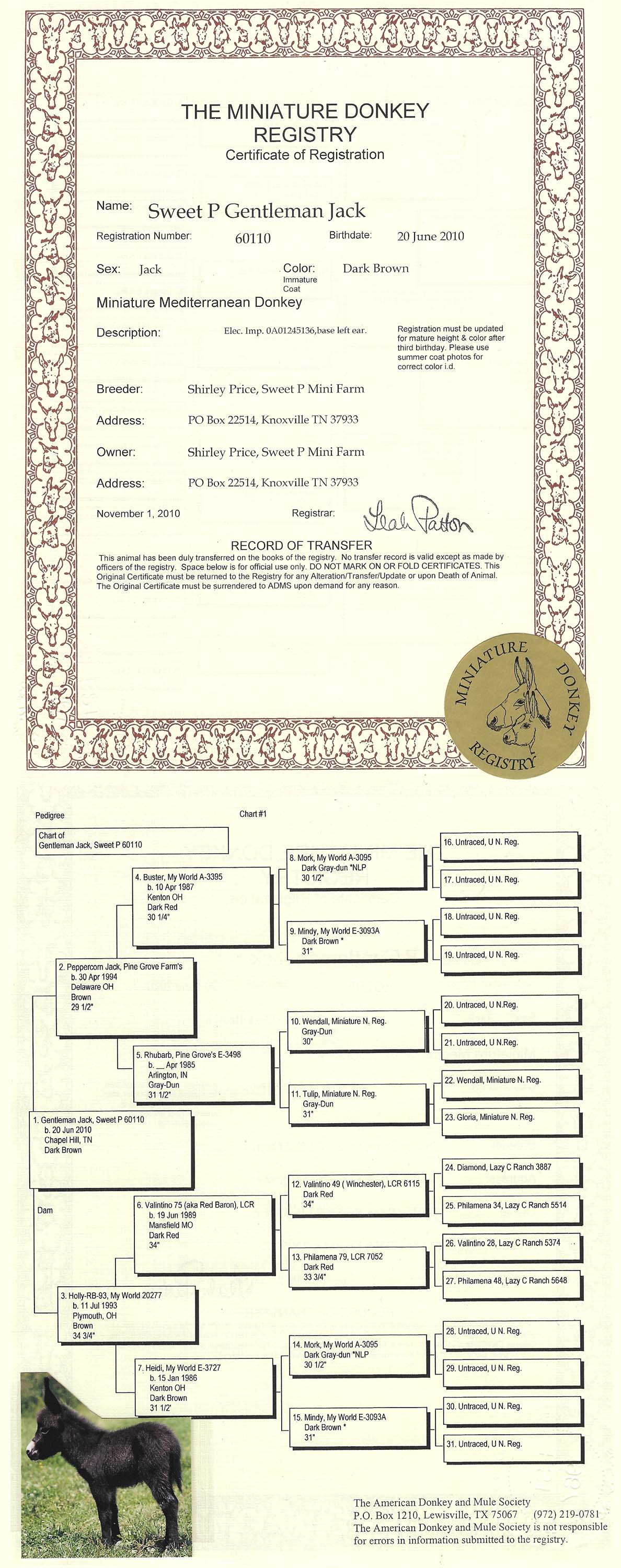 Click MDR sign for Miniature Donkey Registry Pedigree Gentleman Jack's pedigree!